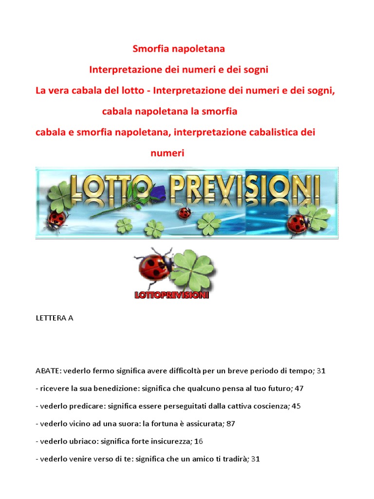 Smorfia Napoletana La Smorfia Napoletana Dall'Italia (1) ai Fagioli (10) Numero 1 - L'Italia. La smorfia è una tradizione antichissima, e ai suoi albori l'Italia era solo il Regno di Napoli (per questo in alcune vecchie versioni al numero uno vi era proprio la città partenopea). Ad ogni modo, se si sogna la patria, la propria città, il numero abbinato è il numero 1. Smorfia Napoletana - Lettera N-Interpretazione dei sogni con la smorfia ... Smorfia Napoletana - Lettera N..Interpretazione dei sogni con la smorfia napoletana...NANO = 15;. vederlo: nemici in agguato, 19; diventarlo: paure Amici Nel Mondo Nostro Estrazioni del Lotto Online La smorfia napoletana interpretazione Sogni Superenalotto 10 e Lotto Si Vince Tutto Eurojackpot
