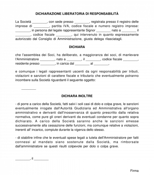 Lettera manleva amministratore uscente. SOCIETA' - Manleva per l'amministratore uscente - notaio-busani.it SOCIETA' - Manleva per l'amministratore uscente. È nullo il patto parasociale che impegni i contraenti a non votare l'azione sociale di responsabilità contro gli amministratori in carica, per le attività da essi compiute posteriormente alla stipula del patto; è invece valido il patto parasociale che impegni a non approvare l'azione ... Lettera di Manleva - Guida e Fac Simile - Nel Portafoglio In questa guida spieghiamo in cosa consiste la lettera di manleva e mettiamo a disposizione un fac simile da scaricare. Per manleva si intende una forma di garanzia con cui una parte, mallevadore, solleva un'altra, manlevato, da una responsabilità o un obbligo. Il termine viene utilizzato anche nel linguaggio processuale, quando un soggetto chiama in […] Manleva Amministratori Società SRL o SPA - Modello La dichiarazione libertaria di responsabilità per amministratori , o manleva, è una dichiarazione attraverso la quale si libera l'amministratore uscente di una Società (SRL o SPA) da eventuali responsabilità per gli atti commessi durante il suo mandato. Generalmente, questa manleva o dichiarazione liberatoria di responsabilità arriva a seguito di una delibera da parte dell'assemblea dei ... Patto di garanzia e manleva dell'amministratore di s.r.l ... L'accordo di manleva stipulato tra una s.r.l. e il suo amministratore unico, obbligatosi a tenere indenne la prima per "ogni passività, sopravvenienza passiva, minusvalenza e insussistenza di attivo, perdita, onere, costo (anche di difesa) di qualsiasi tipo, natura e ammontare" verificatisi fino alla cessazione del mandato, deve ritenersi valido ed efficace, considerata l'esatta ...