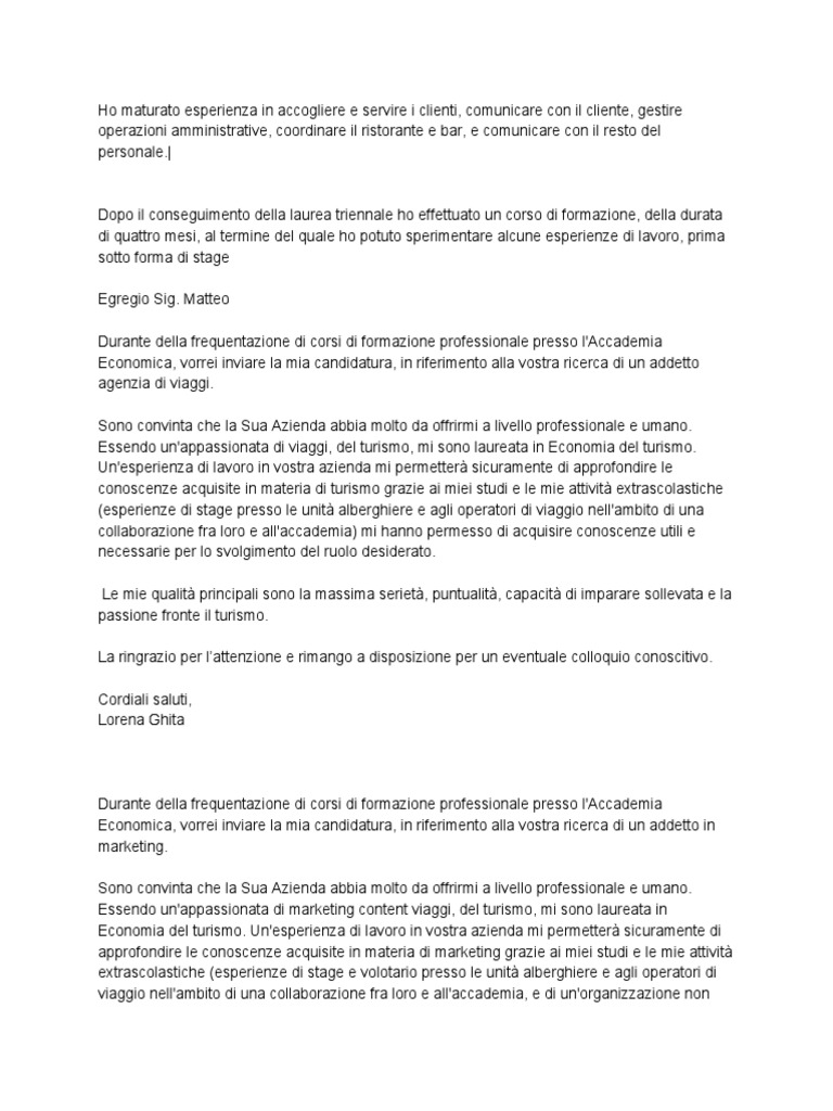 Esempio di lettera di presentazione per consulenti di viaggio Esempio di lettera di presentazione per consulenti di viaggio Ottenete più offerte di lavoro e imparate a migliorare la vostra nuova lettera di presentazione con il nostro esempio gratuito e altamente istruttivo di lettera di presentazione per Travel Consultant. Come scrivere una lettera motivazionale Erasmus [+esempi] - ResumeLab O ora vediamo insieme un esempio di lettera motivazionale che ti farà fare il giro d'Europa! 1. Esempio di lettera motivazionale per l'Erasmus. Abbiamo chiesto ad Alessandra una mano per darti un'idea di come potrebbe suonare una lettera motivazionale per l'Erasmus. ESEMPI DI LETTERE DI PRESENTAZIONE - Agenzia del Lavoro - YUMPU ESEMPI DI LETTERE DI PRESENTAZIONE Federico RicciVia Roma, 2538100 TrentoTel. 0461/556020Spett.leORTEA S.p.a.Ufficio del personaleViaVerdi, 738100 - TRENTOTrento, 28 gennaio 2007Oggetto: candidatura per l'area commercialeEgregio signore,vorrei sottoporre alla Vostra cortese attenzione il mio interesse ad un'eventualeassunzione nella Vostra …
